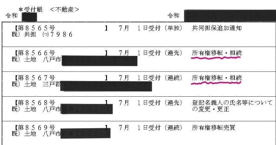 不動産会社は、この受付帳の中から「所有権移転・相続」と記載された案件を選び、さらにその不動産の登記情報を取得することで相続人の氏名・住所を把握します